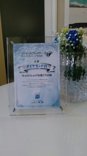 さて、この度 弊社『MADOショップ京都壬生店』はYKKAP株式会社 住宅関西支社主催の『リフォームプレイヤー チャンピョンシップ2020』において、京都エリアの『ダイヤモンド賞』を受賞いたしました(表彰楯とタペストリーと頂きました)